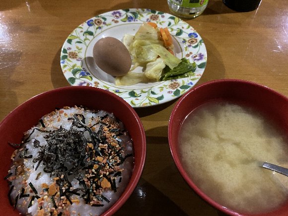朝ご飯は、日本米のおかゆ 味噌汁 ゆで卵に 温野菜 |