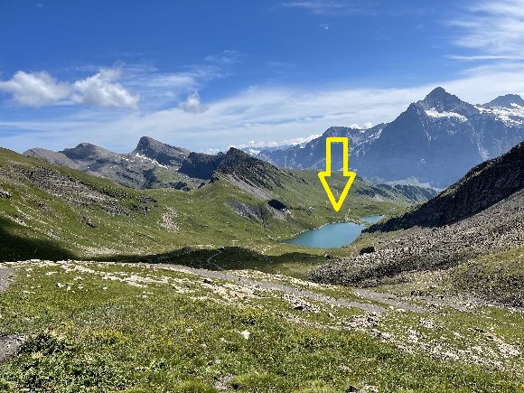 ![]() 休憩した湖 矢印が 山羊攻防で カメラを落とした場所 |
