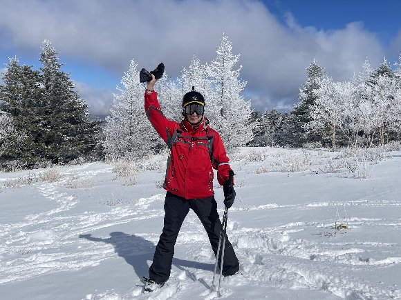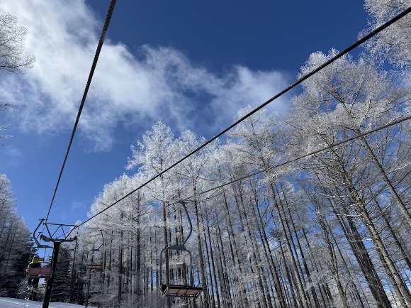 ![]() 再び、第2ペアリフトで、最上部へ 霧氷と青空がきれい |