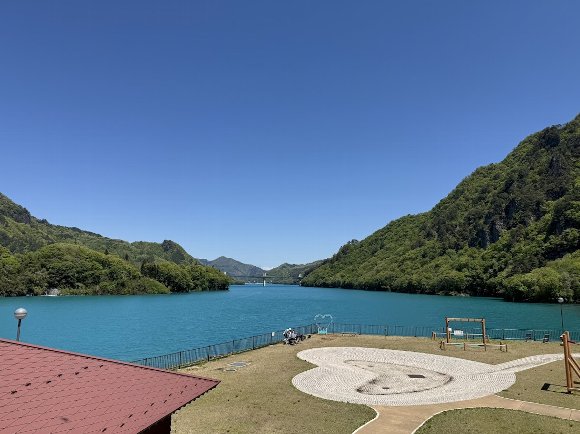 ![]() お外を見れば 青い空 青い湖面 若葉で黄緑の山 |