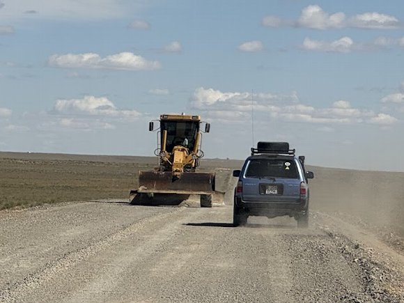 ![]() 未舗装だが路面が良いな と思っていたら 道路整備車が働いていた |