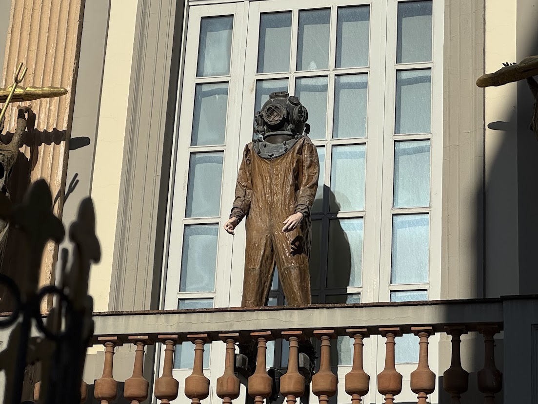 ![]() 講演で ダリが着用し 窒息しそうになった という 潜水服 |