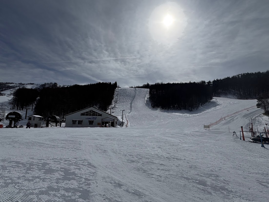 前日から気温が上がった せいか 雪質は ガリガリ 硬く すべりにくく コースも短い