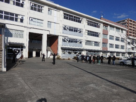 ![]() 応援指導を受ける、桐高応援団と 太高応援団 |