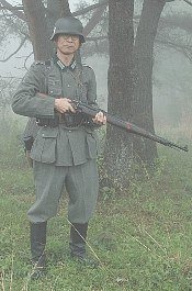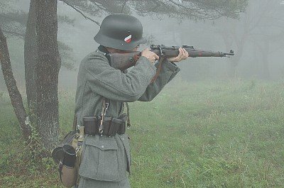 | 霧深い森の中から、独逸兵が | ・・・・・・、米英軍に狙いを定める・・・・き、霧で何にも見えな〜い・・。 |