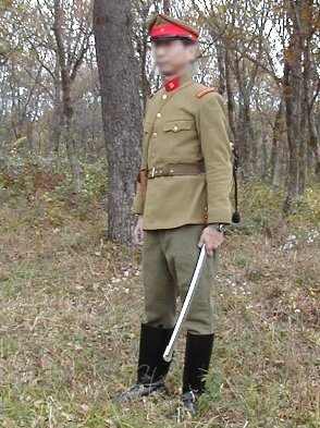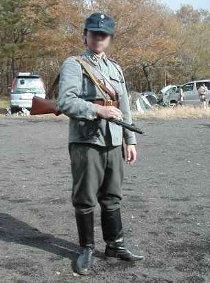 ネオカルテル と 米軍の攻防戦を 厳しい目で見つめる 帝国陸軍士官 なぜかというと・・・・・・特に意味はない・・・ この扮装をしてみたかっただけの話である。 軍帽は 中田製 両手握りのサーベル軍刀 実物拵 胴締 中田製 うわっ・・ |