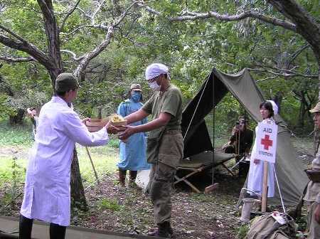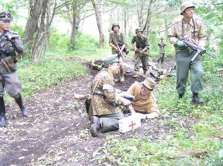 気がつくと、その衛生兵が 「どこが痛いの〜、どこ撃たれたの〜と」 包帯で治療を始めている。