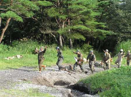 と、前方の丘に米兵発見、 射撃、隠れる 敵も射撃、かくれる。距離があり、らちがあかない。