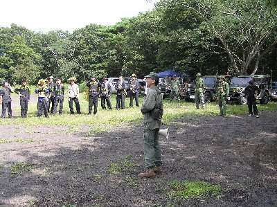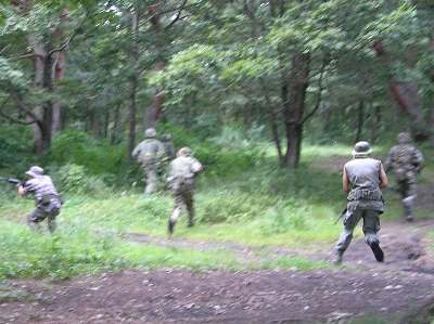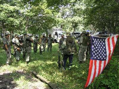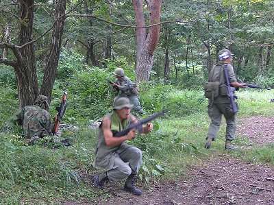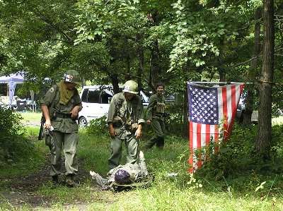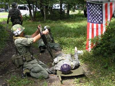 | 「開会宣言」 取扱中尉殿による、 開会宣言、説明がなされる。 「・・・・で、楽しく、あそぼ〜。」 共産軍は、弾数 300発 米軍は、弾数 150発 (LMG除く) とし、戦力均衡をとる。 |