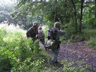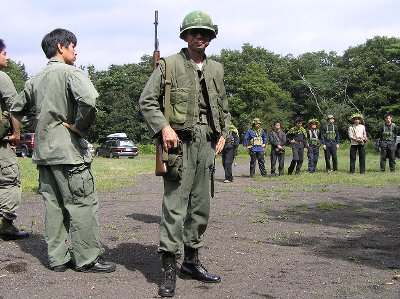 「重い〜、疲れたゼ〜ゼ〜」 救出作戦の午前の最後のゲームに、 超重い、自慢のM60を使用 7.62mmダミー弾約100発 弾の少し入ったバンダリアを2個 M1955アーマー着用 これで、走り回り、撃ちまくる。 そして、ベトコン 1名ゲット 何と弾の効率が悪い事か・・・・ でも。撃ちまくりは、きっもち良い〜! |