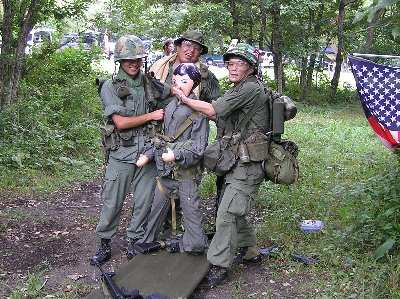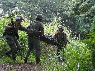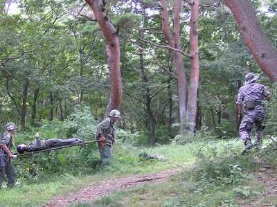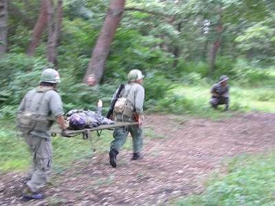 | 「もうすぐ、到着」 。 。特殊部隊にまもられ、 陣地へと向かう。 この担架、重いぜ〜。 |