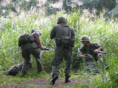 | 「戦闘」 。ベトコンと撃ち合う 米兵 「G.I.ダ〜〜イ!」 「俺はG.I.だーっ!」 さぁ、尋常に勝負勝負〜 |