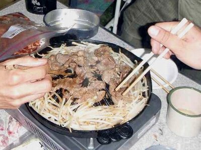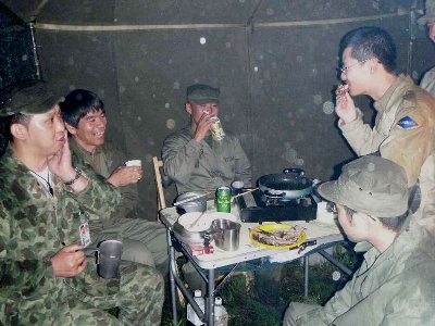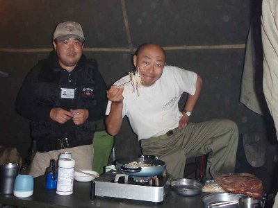 夕方、食料調達部隊が到着、 今日のディナー ジンギスカン鍋である。