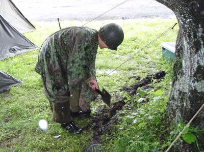 ベーステント内の排水路をつくる、レアンさん |