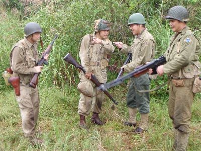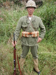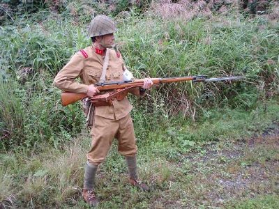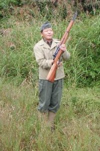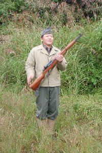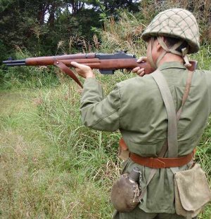 ![]() 帝國海軍 四式自動小銃 . 鉄帽の縛り方は、海軍方式 |